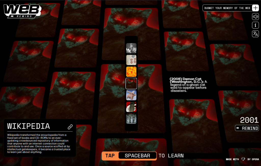 Web Rewind est bien plus qu’un simple musée numérique : c’est une expérience interactive et immersive, conçue pour célébrer les 30 ans du navigateur Opera. En appuyant sur la barre d’espace, vous pouvez voyager d’une année à l’autre, redécouvrant les moments marquants, les tendances, les innovations et même les anecdotes qui ont façonné l’histoire d’Internet. Vous y retrouverez les disquettes, l’essor des NFTs, l’apparition de Wikipedia, mais aussi des souvenirs plus personnels comme les sites de jeux en ligne des années 2000 ou les premiers réseaux sociaux.